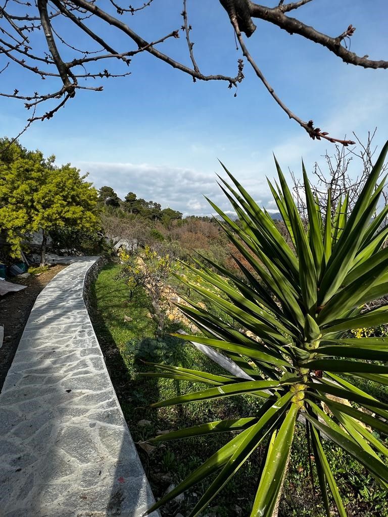 Aan de zijkant van het huis in de prachtige buitenruimte bevindt zich een moderne buitensauna met een glazen pui en een onvergelijkbaar uitzicht door de glazen pui op de zee en het betoverende Ligurische berglandschap.